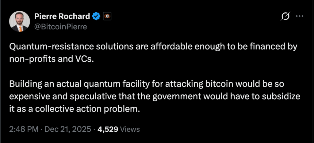 در این میان، چهرههایی مانند پیر روشارد (Pierre Rochard)، از ماکسیمالیستهای شناختهشده بیت کوین، میگویند راهکارهای مقاوم در برابر کوانتوم آنقدرها هم پرهزینه نیستند و حتی میتوانند با حمایت نهادهای غیرانتفاعی و سرمایهگذاران خطرپذیر تأمین مالی شوند.