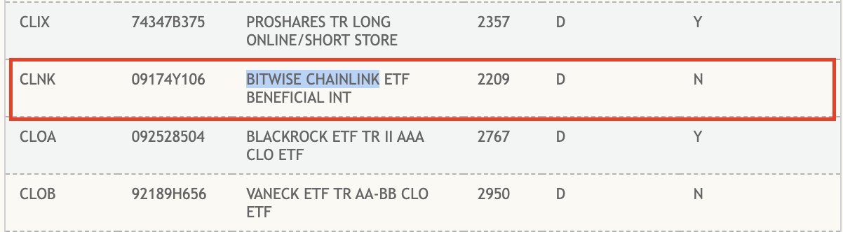 صندوق ETF چینلینک (LINK) شرکت بیتوایز (Bitwise)، بهتازگی در فهرست شرکت سپردهگذاری و تسویه معاملات ایالات متحده (DTCC) قرار گرفته است؛ این اتفاق، معمولاً نشانهای مثبت از نزدیکشدن یک ETF به مرحله راهاندازی تلقی میشود.