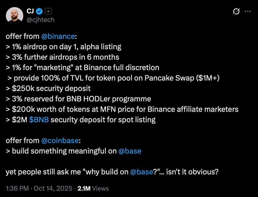 در روزهایی که فضای بازار رمزارزها بیش از هر زمان دیگری درگیر رقابت، شفافیت و بیاعتمادی است، اتهاماتی از سوی مدیرعامل شرکت لیمیتلس لبز (Limitless Labs) علیه صرافی بایننس (Binance) بار دیگر نگاهها را به پشتپرده فرآیند لیستشدن توکنها جلب کرده است. سیجی هدرینگتون (CJ Hetherington) ادعا کرده که بایننس از پروژههای جدید برای لیستکردن توکنهایشان مبالغ هنگفتی دریافت میکند و حتی بخشی از عرضه توکن را به نفع خود برمیدارد!