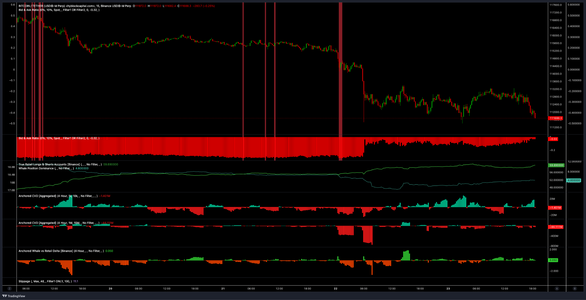 با نگاهی دقیق‌تر، شاخص «حساب‌های لانگ و شورت خرده‌فروشی واقعی» در صرافی بایننس نشان می‌دهد که معامله‌گران خرد و نهنگ‌ها از روز دوشنبه به بعد همزمان با افت قیمت بیت کوین، پوزیشن‌های لانگ اهرمی خود را افزایش داده‌اند. علاوه بر این، CVD گروه دارندگان بین ۱ تا ۱۰ میلیون دلار و CVD چهارساعته گروه دارندگان بین ۱٬۰۰۰ تا ۱۰٬۰۰۰ دلار، جدال خریداران و فروشندگان را برجسته می‌کند.