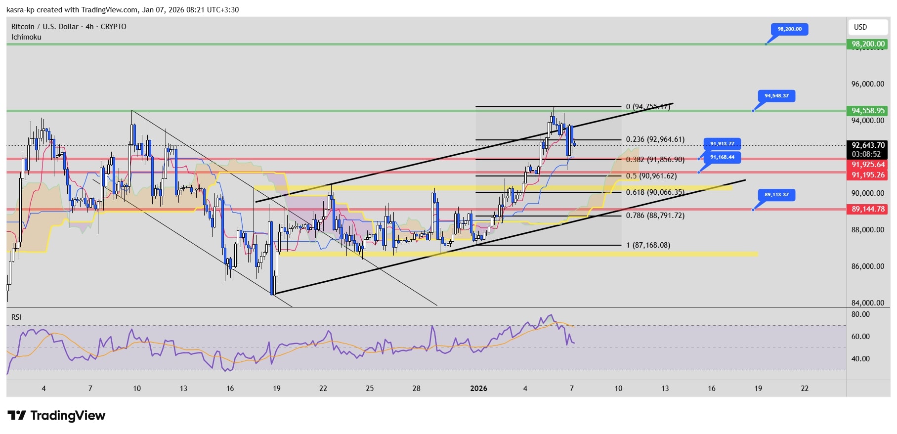 در بررسی وضعیت تحلیل تکنیکال بیت کوین، مشاهده میشود که قیمت دقیقاً بر اساس پیشبینیهای قبلی، سقف کانال صعودی خود را شکسته و تا محدوده حساس ۹۴,۵۴۸ دلار پیشروی کرده است. با این حال، به دلیل اهمیت بالای این سطح در تایمفریمهای بالاتر، قیمت پس از برخورد با آن نتوانست حمایت لازم را برای تثبیت حفظ کند و مجدداً به درون کانال صعودی بازگشت. این عقبنشینی منجر به لمس هدف ۹۱,۰۰۰ دلاری شد که با نگاهی به ابزار فیبوناچی، نشاندهنده اصلاح ۳۸ درصدی روند قبلی است؛ اما با توجه به اینکه هنوز پولبک مشخصی به سقف محدوده سایدوی قبلی صورت نگرفته، احتمال تداوم این اصلاح تا سطح ۵۰ درصد فیبوناچی همچنان پابرجا است.