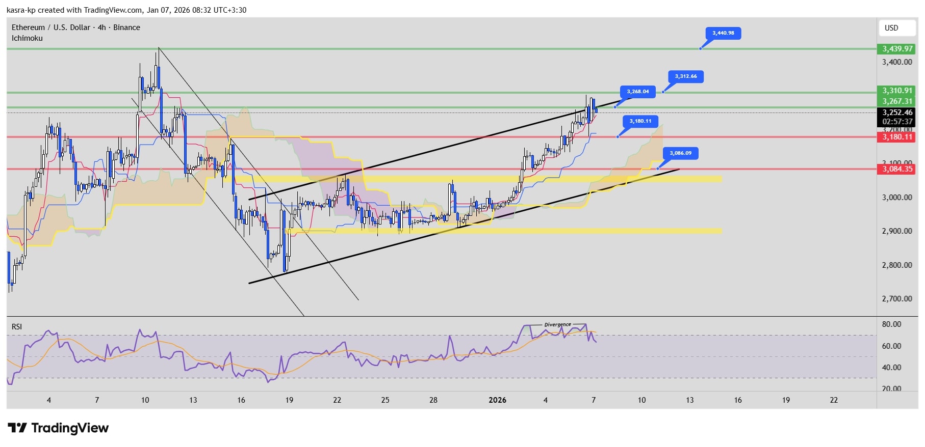وضعیت در نمودار قیمت اتریوم نیز شباهتهای ساختاری زیادی با بیت کوین دارد، به طوری که پس از برخورد قیمت به محدوده ۳,۲۵۰ دلار، ظهور کندلهای نزولی پرقدرت حاکی از وجود یک سد مقاومتی مستحکم در این منطقه است. اگرچه اندیکاتور RSI تلاش فروشندگان برای تسلط بر بازار اتریوم را نیز تایید میکند، اما نکته حائز اهمیت، پایداری بیشتر روند صعودی در اتریوم نسبت به بیت کوین است که باعث شده تاکنون یک لگ اصلاحی کامل در این تایمفریم شکل نگیرد.