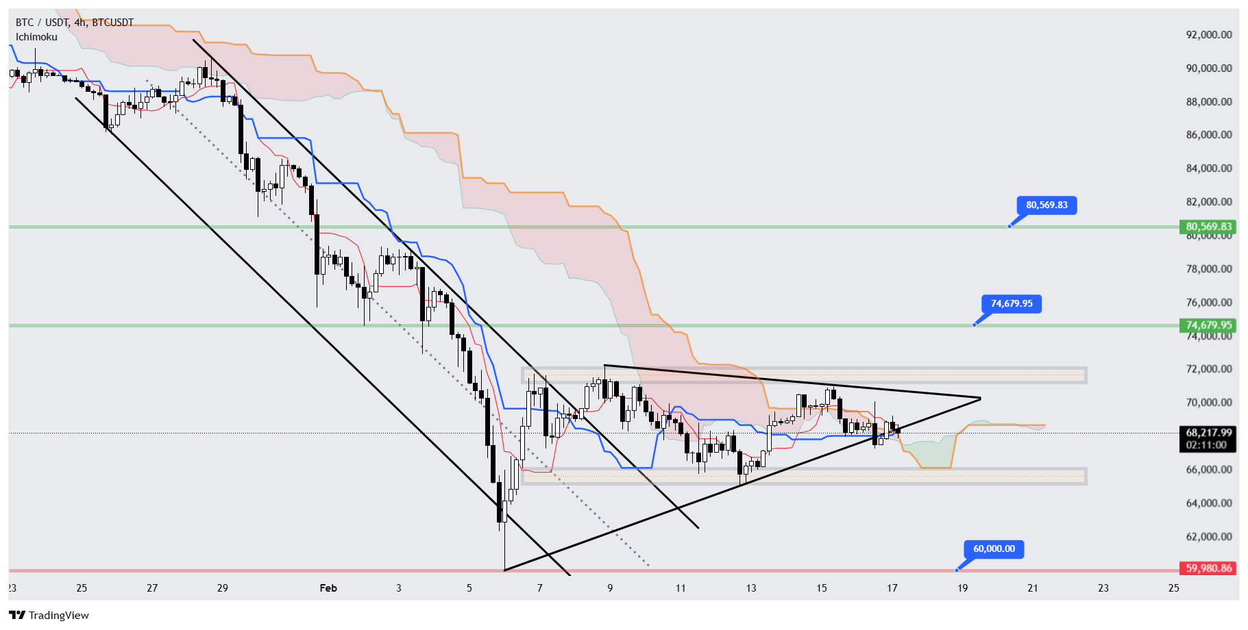 در حال حاضر، یک الگوی مثلث جمعشونده شکل گرفته است که شکست آن از هر طرف، قیمت را به سمت سقف یا کف این کانال رنج هدایت خواهد کرد. در صورت شکست کف این محدوده، انتظار اولیه ما ریزش قیمت تا سطح ۶۰,۰۰۰ دلار میتواند باشد؛ اما در مقابل، اگر شکست پرقدرتی از سقف کانال رخ دهد، میتوان انتظار رسیدن به هدف ۷۴,۶۷۰ دلار در گام اول و سپس حتی محدوده ۸۰,۰۰۰ دلار را داشت.