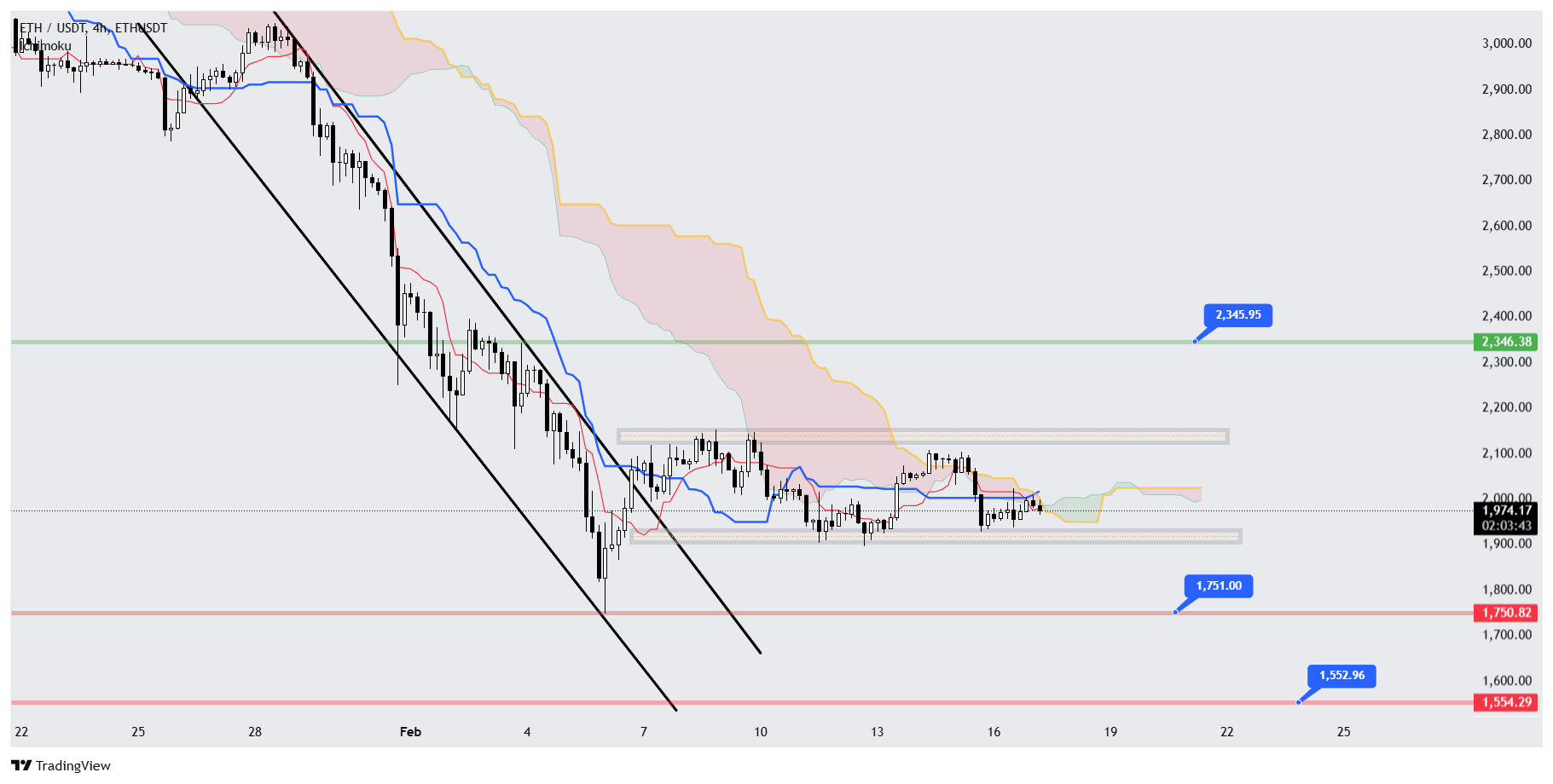 بررسی وضعیت اتریوم نیز سناریوی مشابهی را روایت میکند. قیمت اتریوم پس از خروج از کانال نزولی خود، وارد یک محدوده رنج شده و بین دو سطح ۲,۱۳۵ دلار و ۱,۹۰۰ دلار تثبیت شده است. در صورتی که شکست از کف این ناحیه اتفاق بیفتد، احتمال سقوط قیمت تا سطح ۱,۷۵۰ دلار و در صورت تداوم فشار فروش، تا محدوده ۱,۵۵۲ دلار وجود دارد. اما اگر قیمت موفق به عبور از سقف کانال شود، هدف بعدی محدوده ۲,۳۴۵ دلار خواهد بود.