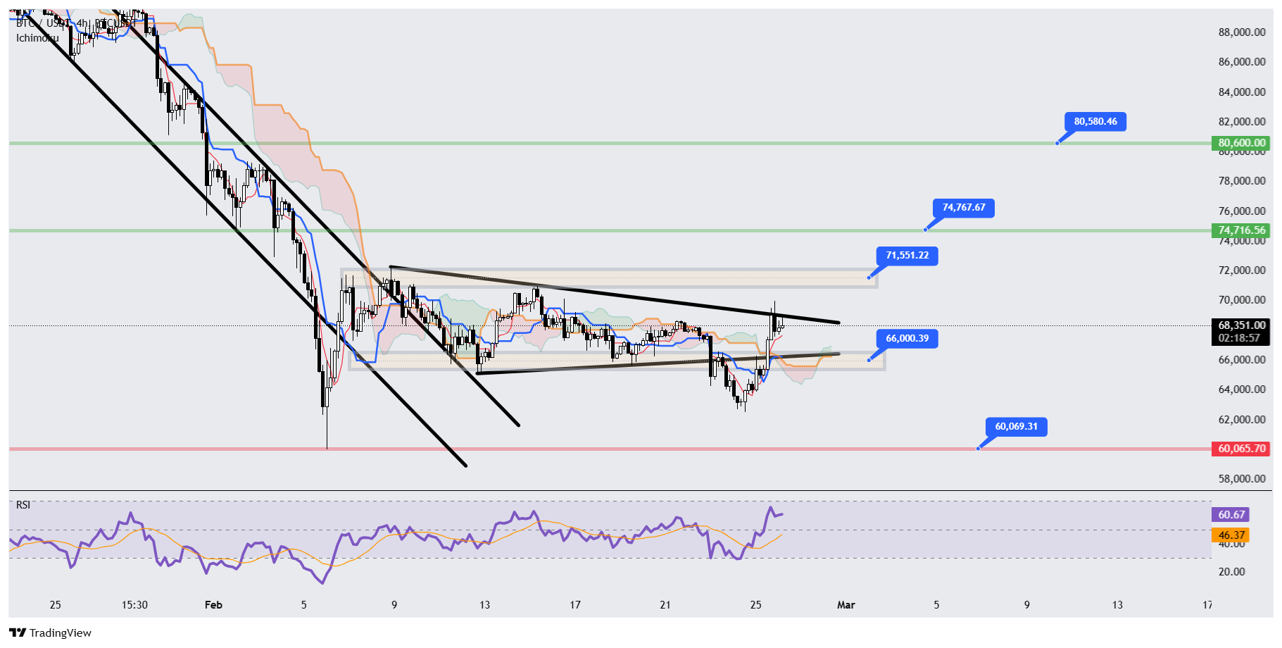 بیت کوین پس از خروج از کانال نزولی خود، مدتی در یک الگوی مثلث جمع‌شونده مشغول رنج زدن بود تا اینکه سرانجام با شکستی پرقدرت از این ناحیه خارج شد و تا نزدیکی محدوده ۶۲,۰۰۰ دلار عقب‌نشینی کرد. در آن مقطع، تصور غالب این بود که قیمت با انجام یک پولبک به سطح ۶۶,۰۰۰ دلار، روند نزولی خود را از سر می‌گیرد؛ اما بازار مسیر متفاوتی را انتخاب کرد. با شکست رو به بالای سطح ۶۶,۰۰۰ دلار، قیمت بیت کوین مجدداً به ناحیه رنج قبلی بازگشت و اکنون با سقف مثلثی که پیش‌تر در آن قرار داشت، برخورد کرده است.