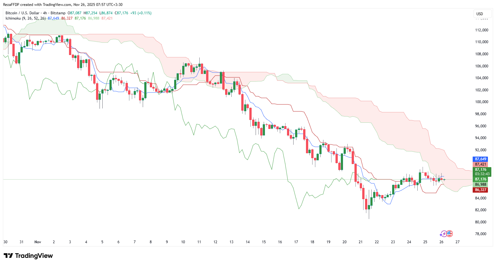 در تایمفریم ۴ ساعته، هم بیتکوین و هم اتریوم بعد از یک ریزش سنگین وارد فاز استراحت شدهاند و فعلاً زیر ابر قرمز ایچیموکو نوسان میکنند؛ یعنی ساختار بزرگمدت هنوز نزولی است. بیتکوین حوالی مقاومتهای ۸۷–۸۸ هزار درگیر است و تا وقتی بالای این محدوده و ابر تثبیت نشود، حرکت اخیر بیشتر شبیه یک اصلاح در دل روند نزولی میماند تا شروع ترند صعودی.