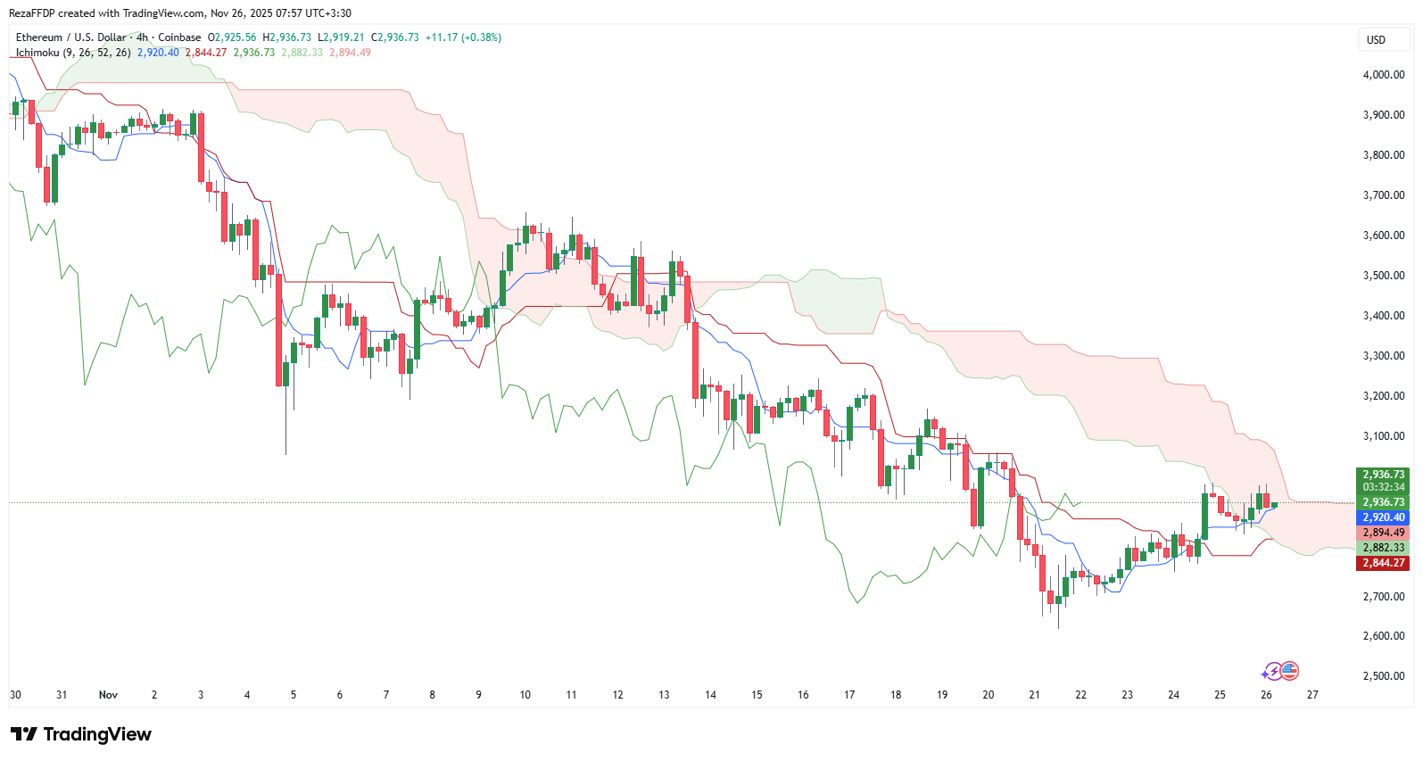 در نمودار ۴ ساعته اتریوم هم روند غالب، مشابه بیتکوین، نزولی است و قیمت برای مدت طولانی زیر ابر قرمز حرکت کرده؛ با این تفاوت که در چند کندل اخیر برگشت قویتری داشته و توانسته تا لبههای ابر برسد.