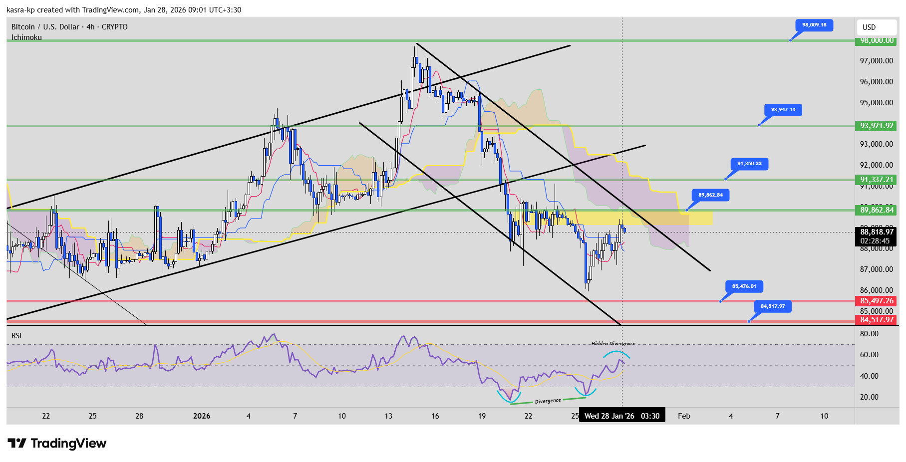 در حال حاضر، قیمت به محدوده مقاومتی حساس ۸۹,۱۴۶ تا ۸۹,۸۶۰ دلار رسیده است و وجود یک واگرایی مخفی نزولی در اندیکاتور آراسآی در کنار تحلیلهای زمانی، احتمال بازگشت قیمت به سمت اهداف ۸۵,۴۷۶ و ۸۴,۵۱۷ دلار را افزایش میدهد اما در مقابل، عبور مقتدرانه از سطح ۸۹,۸۶۲ دلار و خروج از کانال، نشانهای جدی برای تغییر روند به صعودی خواهد بود که میتواند اهداف ۹۳,۹۴۰ و حتی ۹۸,۰۰۰ دلار را در پی داشته باشد.