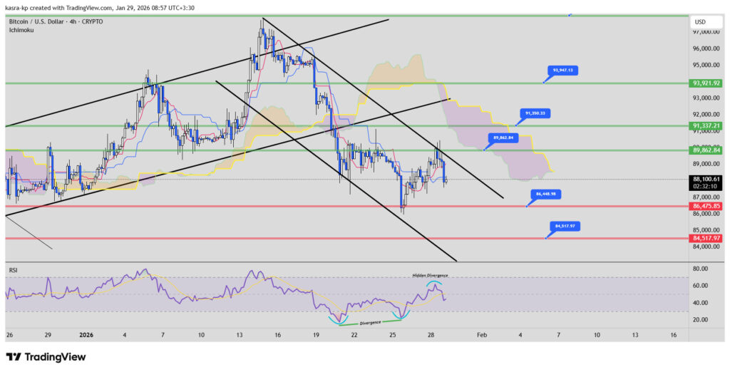 بررسی وضعیت قیمت بیت کوین در تایم‌فریم ۴ ساعته نشان می‌دهد که قیمت دقیقاً طبق تحلیل‌ روزهای گذشته در یک ساختار نزولی قرار داشته و برای تداوم این مسیر، نیاز به برخورد با یک سطح مقاومتی معتبر داشته است. قیمت با رسیدن به سطح کلیدی ۸۹۸۶۰ دلار که با خط روند کانال نزولی همپوشانی داشت، واکنش منفی نشان داده و با افت ۳ درصدی مواجه شده است.