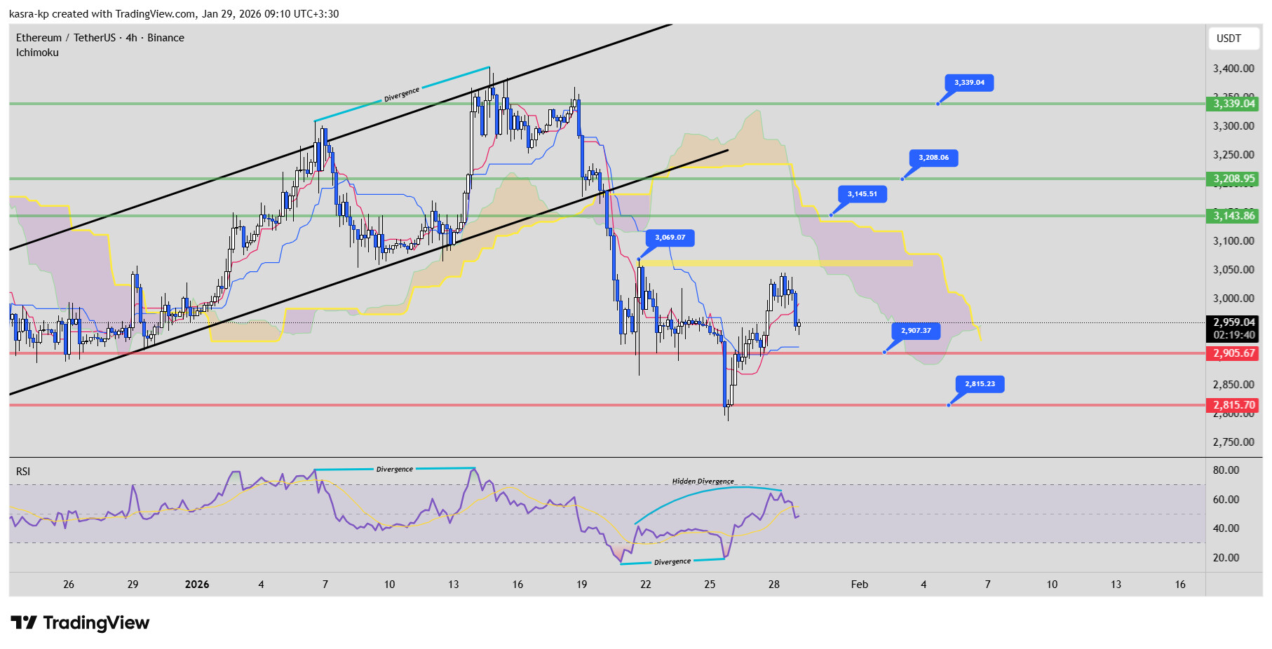 اتریوم نیز علی‌رغم اصلاح عمیق خود، موفق نشد سقف قبلی را برای تغییر روند به صعودی پس بگیرد و همگام با بیت کوین، افت ۳ درصدی را تجربه کرده است. در حالی که می‌توان این حرکت را حتی پولبکی در تایم‌فریم‌های پایین‌تر دید، اما ساختار کلی در این تایم‌فریم یعنی چهار ساعته همچنان نزولی است و انتظار می‌رود قیمت ابتدا به هدف ۲۹۰۷ دلار و سپس ۲۸۱۵ دلار برسد.