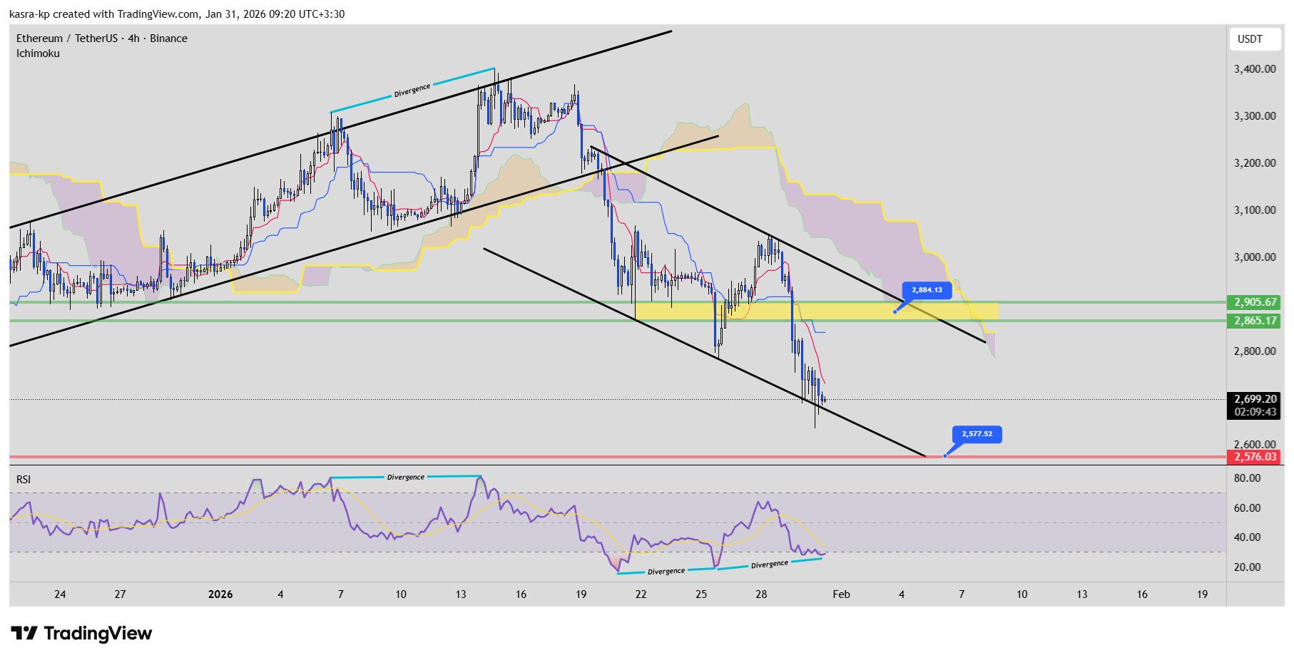 با رسیدن به این سطح، انتظار میرود قیمت اتریوم یک حرکت اصلاحی را آغاز کند که در گام نخست میتواند تا ۲۷۷۶ دلار و در صورت ادامه، تا منطقه مقاومتی مهم ۲۸۸۰ دلار پیش برود. با این حال، اگر ریزش دنبالهدار باشد و قیمت بدون اصلاح و با مومنتوم پرشتاب بخواهد سطح فعلی را بشکند، انتظار ما برای اولین تارگت نزولی محدوده ۲۵۷۷ دلار خواهد بود.