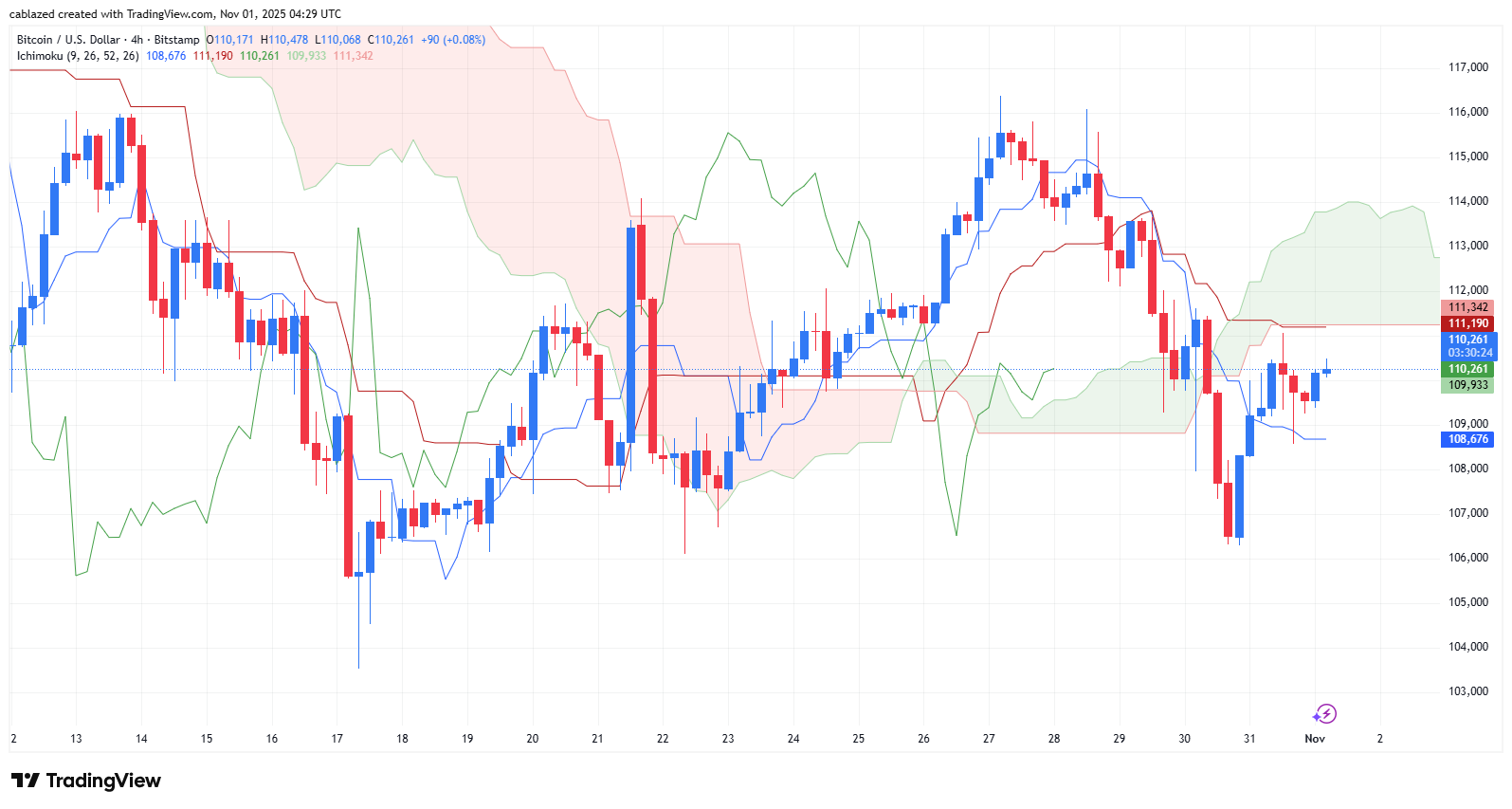 در نمودار چهار ساعته قیمت بیت کوین، قیمت در حال حاضر در محدوده ۱۱۰٬۲۶۱ دلار معامله میشود. اندیکاتور ایچیموکو نشان میدهد که بیت کوین پس از ریزش اخیر از مقاومت ابر کومو عبور نکرده و همچنان زیر خطهای مقاومتی ۱۱۱٬۱۹۰ دلار (کجنسن) و ۱۱۱٬۳۴۲ دلار (سنکو اسپن A) قرار دارد.