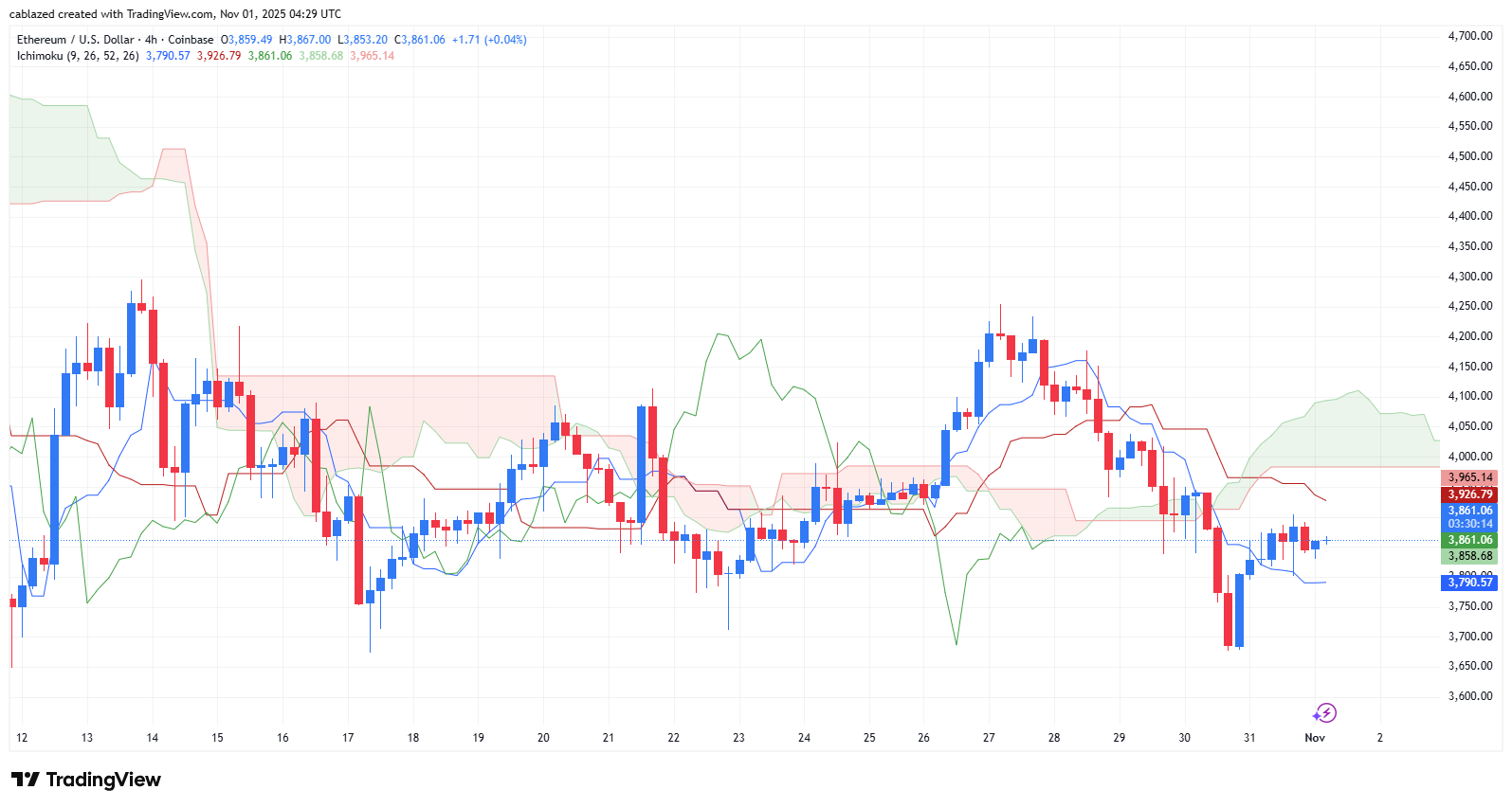 در مورد قیمت اتریوم نیز وضعیت مشابهی دیده میشود. قیمت در حال حاضر در محدوده ۳٬۸۶۱ دلار قرار دارد و مانند بیت کوین، زیر ابر کومو و خطوط مقاومتی کلیدی ایچیموکو معامله میشود.