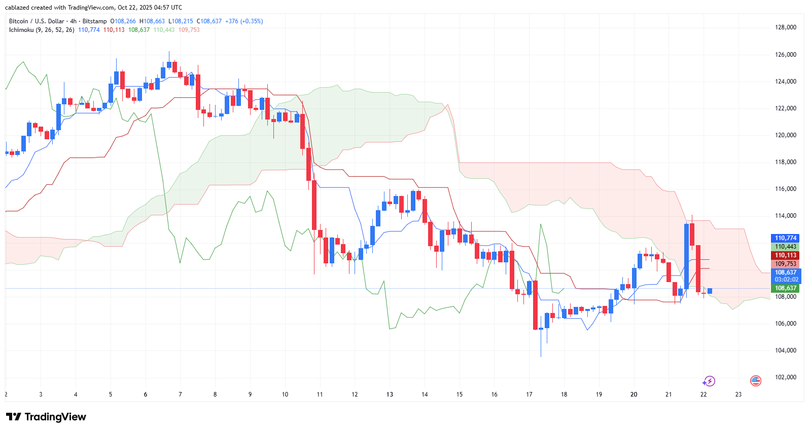 در نمودار قیمت بیت کوین، اندیکاتور ایچیموکو نشانههایی از تردید در روند فعلی را نمایش میدهد. پس از جهش قیمت تا محدوده ۱۱۴٬۰۰۰ دلار، فشار فروش در ناحیه ابر کوموی قرمز باعث بازگشت قیمت به سطح ۱۰۸٬۶۰۰ دلار شده است. در حال حاضر، قیمت زیر محدوده تعادلی ابر قرار دارد که بیانگر ضعف موقت در مومنتوم صعودی است. خطوط تنکانسن (آبی) و کیجونسن (قرمز) در حالت کراس نزولی قرار گرفتهاند و این موضوع احتمال ادامه اصلاح را تقویت میکند.