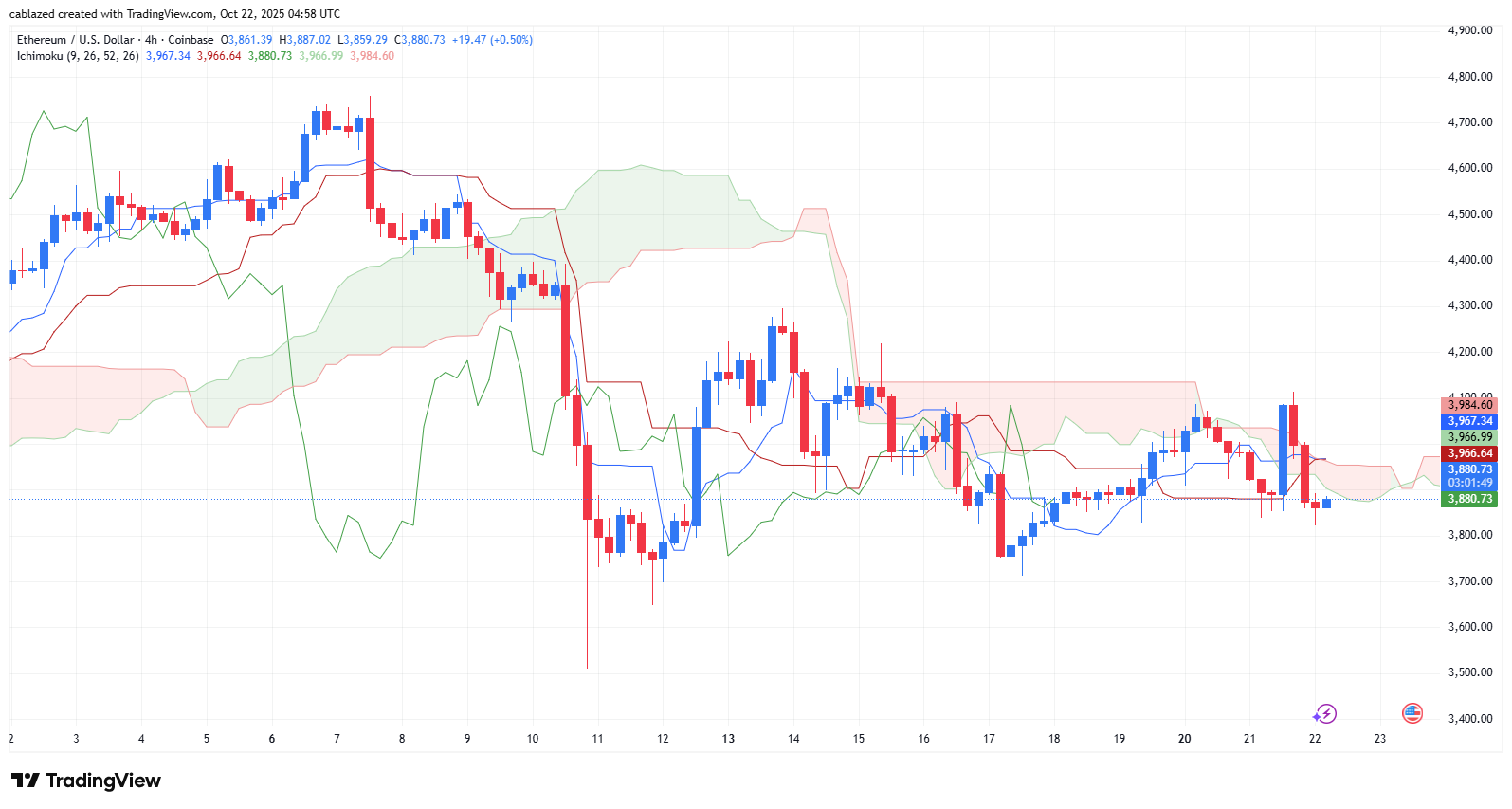 رفتار قیمت اتریوم مشابه بیت کوین اما با ضعف نسبی بیشتر مشاهده میشود. قیمت نتوانست بالای ابر کوموی قرمز تثبیت شود و پس از برخورد با مقاومت ۳٬۹۸۰ دلار مجدداً با فشار فروش مواجه شد. در حال حاضر قیمت در محدوده ۳٬۸۸۰ دلار و دقیقا در لبه پایینی ابر کومو نوسان دارد که این موقعیت از نظر ایچیموکو نشانهای از بلاتکلیفی بازار است.