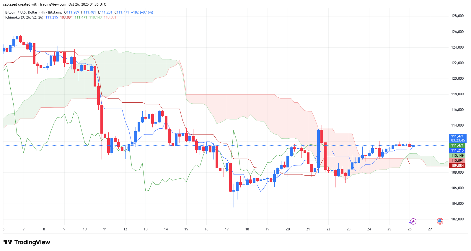 در نمودار چهارساعته بیت کوین (BTC/USD)، قیمت در محدوده حدود ۱۱۱٬۴۰۰ دلار قرار دارد و پس از عبور از ابر کومو، در فاز تثبیت بالای آن قرار گرفته است.