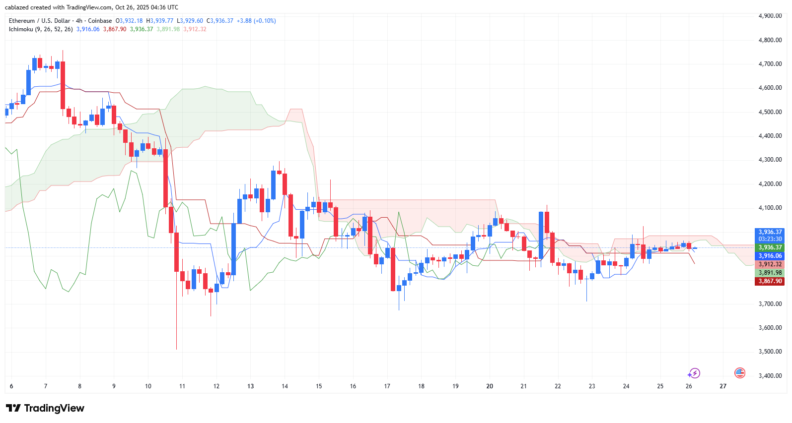 در نمودار چهارساعته اتریوم (ETH/USD)، قیمت در محدوده ۳٬۹۳۰ دلار نوسان دارد و برخلاف بیت کوین، هنوز نتوانسته بالای ابر کومو تثبیت شود.