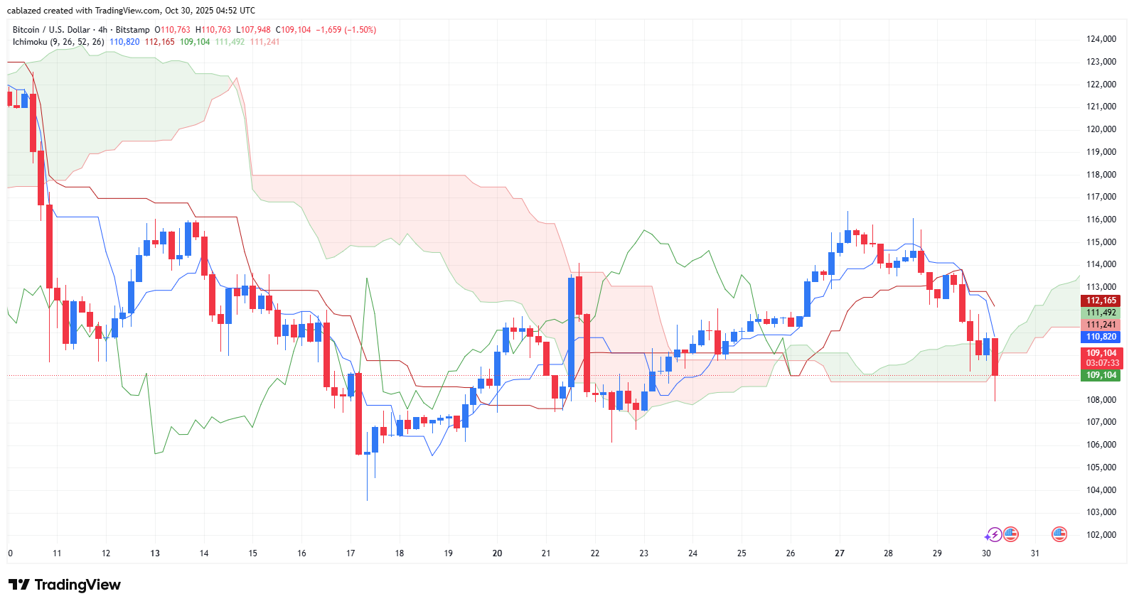 در معاملات امروز (۳۰ اکتبر ۲۰۲۵ / ۸ آبان)، بازار رمزارزها پس از چند روز نوسان محدود، بار دیگر تحت فشار فروش قرار گرفته است. شاخص‌های تکنیکال در نمودارهای چهار ساعته بیت کوین و اتریوم نشان می‌دهند که هر دو دارایی در فاز اصلاحی و زیر ابر ایچیموکو قرار دارند.
