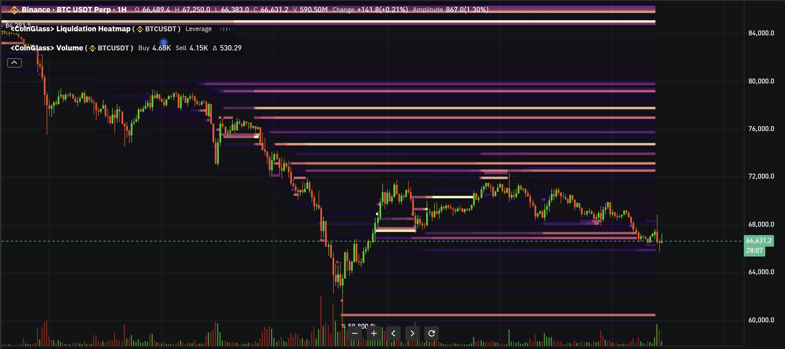نقشه‌های حرارتی نقدینگی بیت کوین نشان می‌دهند که سفارش‌های متراکم در بالای ۷۲٬۰۰۰ دلار وجود دارد، اما در عین حال یک خلأ نقدینگی (Liquidity Void) بین ۶۶٬۰۰۰ تا ۶۰٬۵۰۰ دلار دیده می‌شود. این خلأ نقدینگی می‌تواند مانند یک آهنربا عمل کند، زیرا قیمت معمولاً به سرعت از مناطق کم‌نقدینگی عبور می‌کند تا به خوشه‌های استاپ و سفارش‌های متراکم برسد.