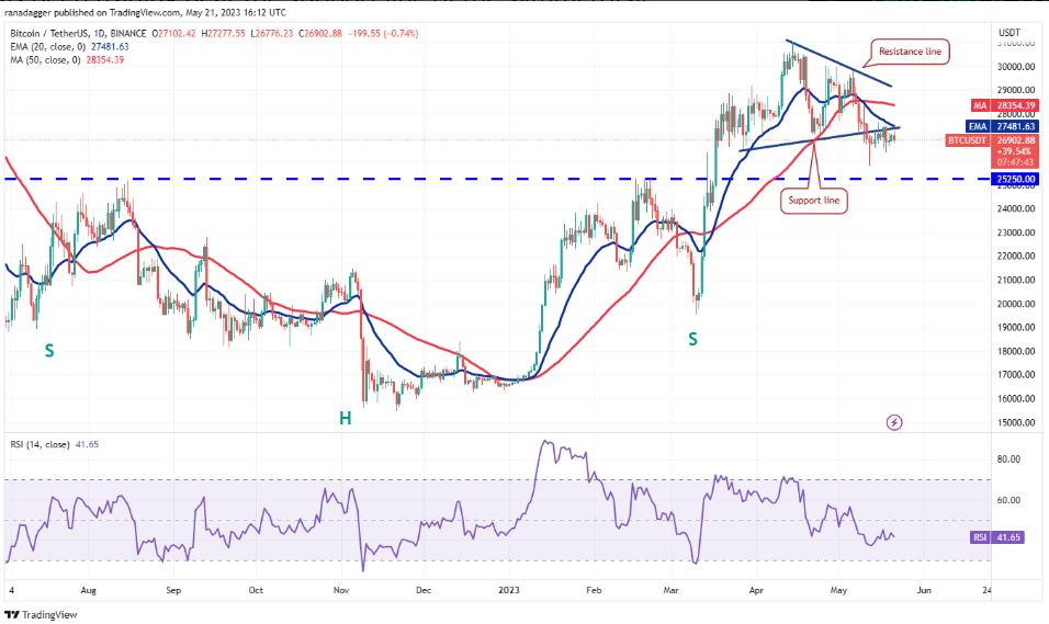 بیت کوین در نزدیکی خط حمایت الگوی مثلث متقارن خود در حال نوسان است، اما گاوها (خریداران) نتوانسته‌اند قیمت آن را به بالای سطح مذکور برسانند. این نشان می‌دهد که خرس‌ها (فروشندگان) در حال اعمال فشار در سطوح بالاتر هستند.