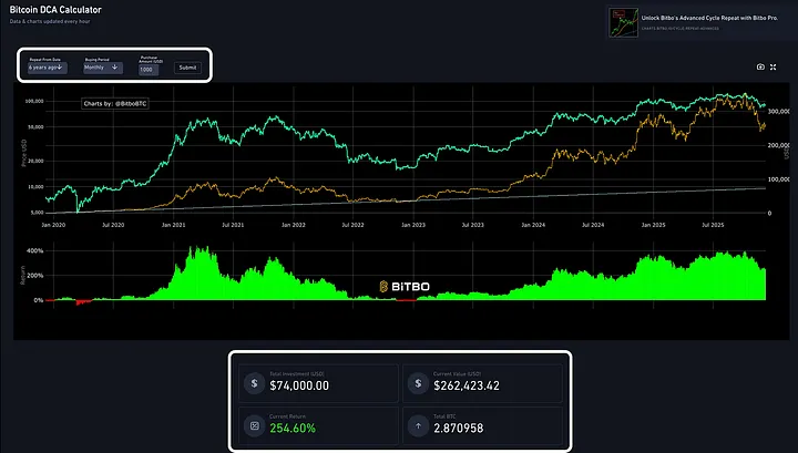 میانگین کم کردن هزینه خرید یا همان سرمایهگذاری پلهای منظم، در چرخههای مختلف بارها نشان داده که میتواند اثر شوکهای بازار را نرم کند. برای نمونه، اگر کسی ماهی ۱,۰۰۰ دلار به مدت شش سال سرمایهگذاری کند، مجموع سرمایهگذاریاش حدود ۷۲ هزار دلار میشود و در سناریوهای تاریخیِ صعودیِ چندچرخهای، این روش میتواند به ارزشهای چندبرابری برسد.