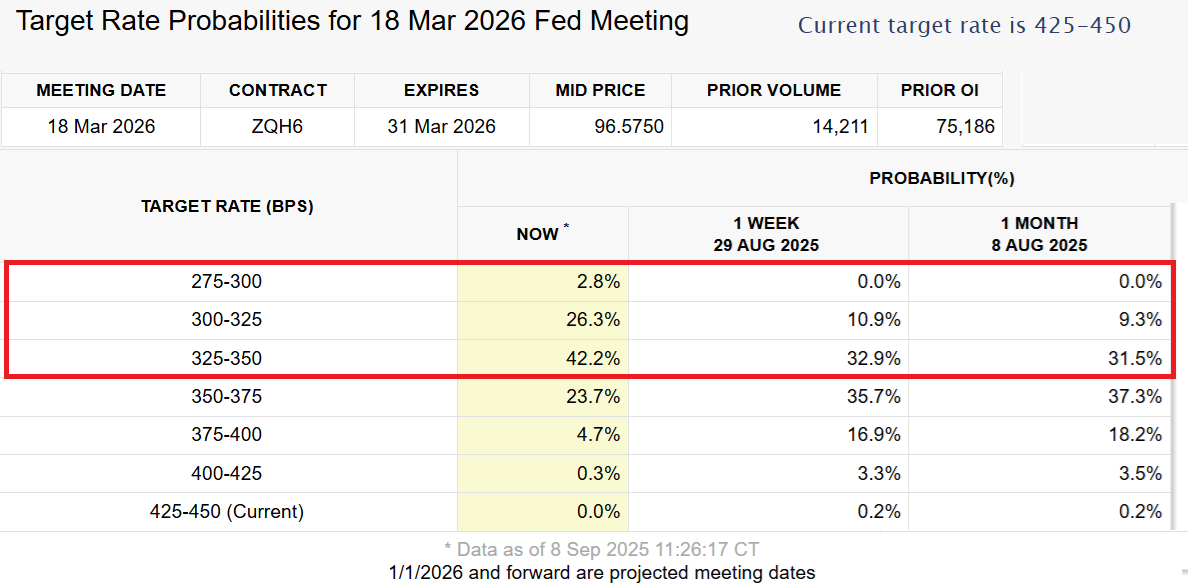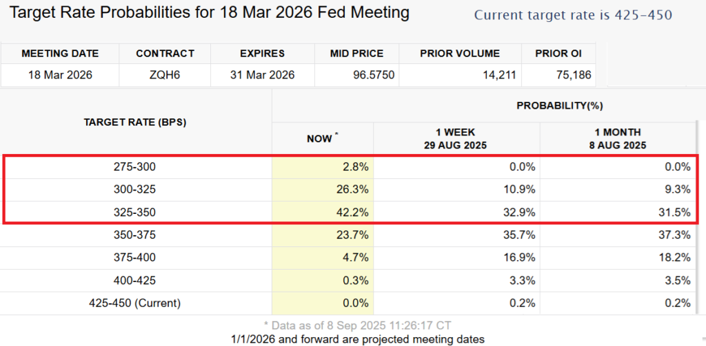 بر اساس ابزار CME FedWatch، معاملهگران اکنون احتمال کاهش نرخ بهره به ۳٫۵۰٪ یا کمتر تا ماه مارس ۲۰۲۶ را ۷۳٪ ارزیابی میکنند؛ این رقم یک ماه پیش ۴۱٪ بود.
