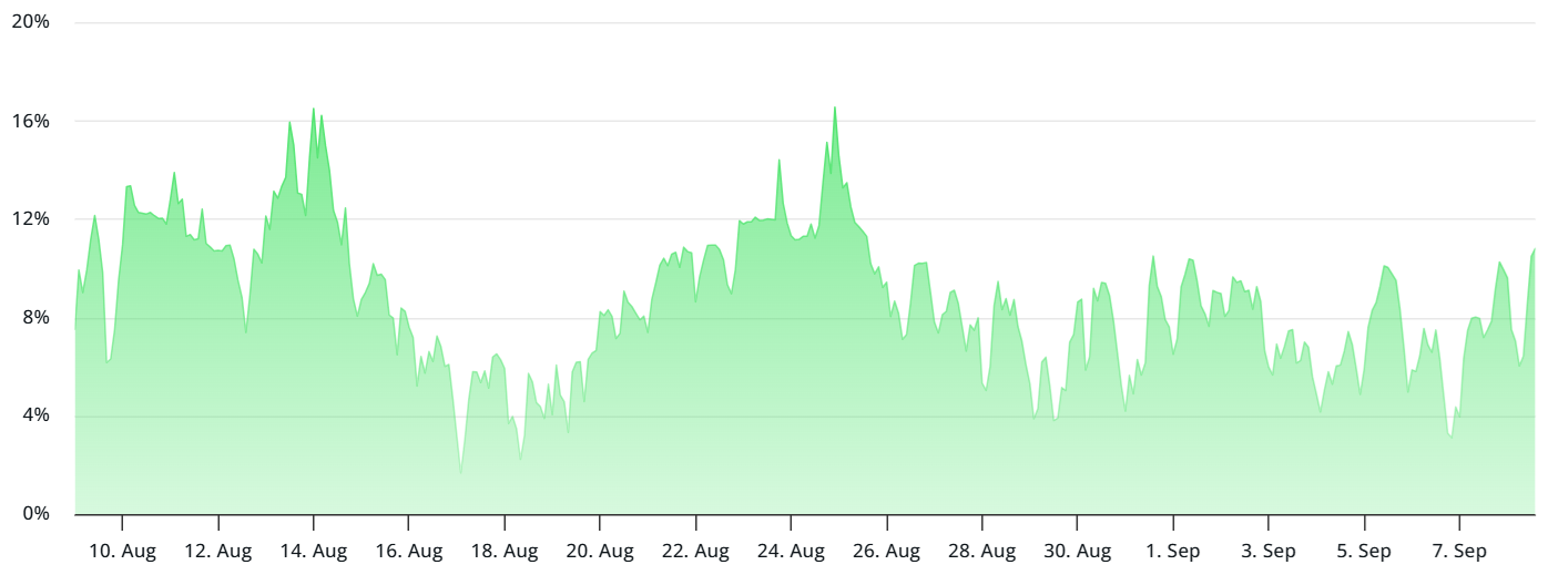 در حال حاضر، فاندینگ ریت قراردادهای دائمی بیت کوین روی سطح خنثای ۱۱٪ قرار دارد. با وجود خنثی بودن، این وضعیت نسبت به سطح نزولی ۴٪ که روز یکشنبه ثبت شده بود، بهبود نشان میدهد. واکنش معاملهگران بهویژه پس از آنکه نزدک درخواست خود را به کمیسیون بورس و اوراق بهادار ایالات متحده (SEC) برای لیستکردن اوراق بهادار سهام توکنیزهشده و ETFها ارائه کرد، احتمالاً ناشی از افزایش رقابت آلتکوینها است.