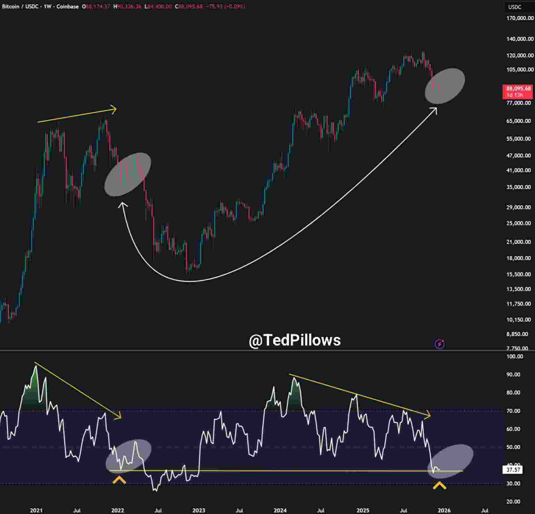 او در کنار این نظر، نمودار هفتگی را منتشر کرد که واگرایی‌های نزولی شاخص قدرت نسبی (RSI) را در مقطع فعلی با دوره‌ای از سال ۲۰۲۱ (آخرین سال از بازار صعودی قبلی بیت کوین) مقایسه می‌کرد.
