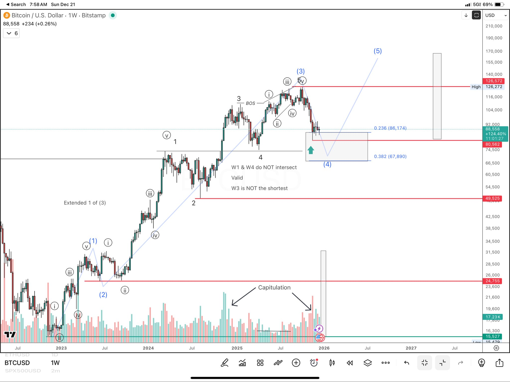 احتمالاً هنوز یک سقف بالاتر دیگر برای موج پنجم (W5) تا محدوده ATH می‌بینیم تا ساختار ۵ موجی کامل شود… اهداف صعودی را تا ۱۵۰ هزار دلار پروجکت می‌کنم.