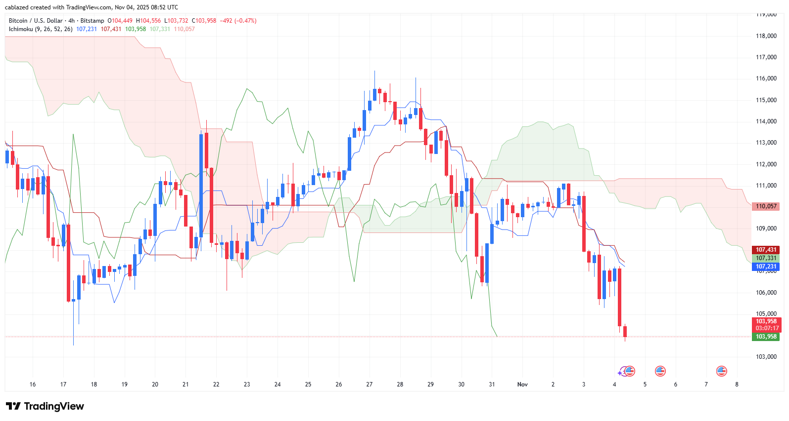 در نمودار ۴ ساعته، قیمت بیت کوین به طور قاطع زیر ابر کومو (Kumo) تثبیت شده است که نشاندهنده فعال شدن یک سیگنال نزولی قوی در کوتاهمدت است. این ابر و خطوط میانی آن (سنکو اسپن A و B) در محدوده تقریبی ۱۱۰,۰۰۰ تا ۱۱۱,۰۰۰ دلار اکنون به مقاومتهای مستحکم تبدیل شدهاند. همچنین، وقوع کراس نزولی (تنکانسن زیر کیجونسن) در محدوده ۱۰۷,۰۰۰ دلار، تأییدی بر غلبه فشار فروش است.