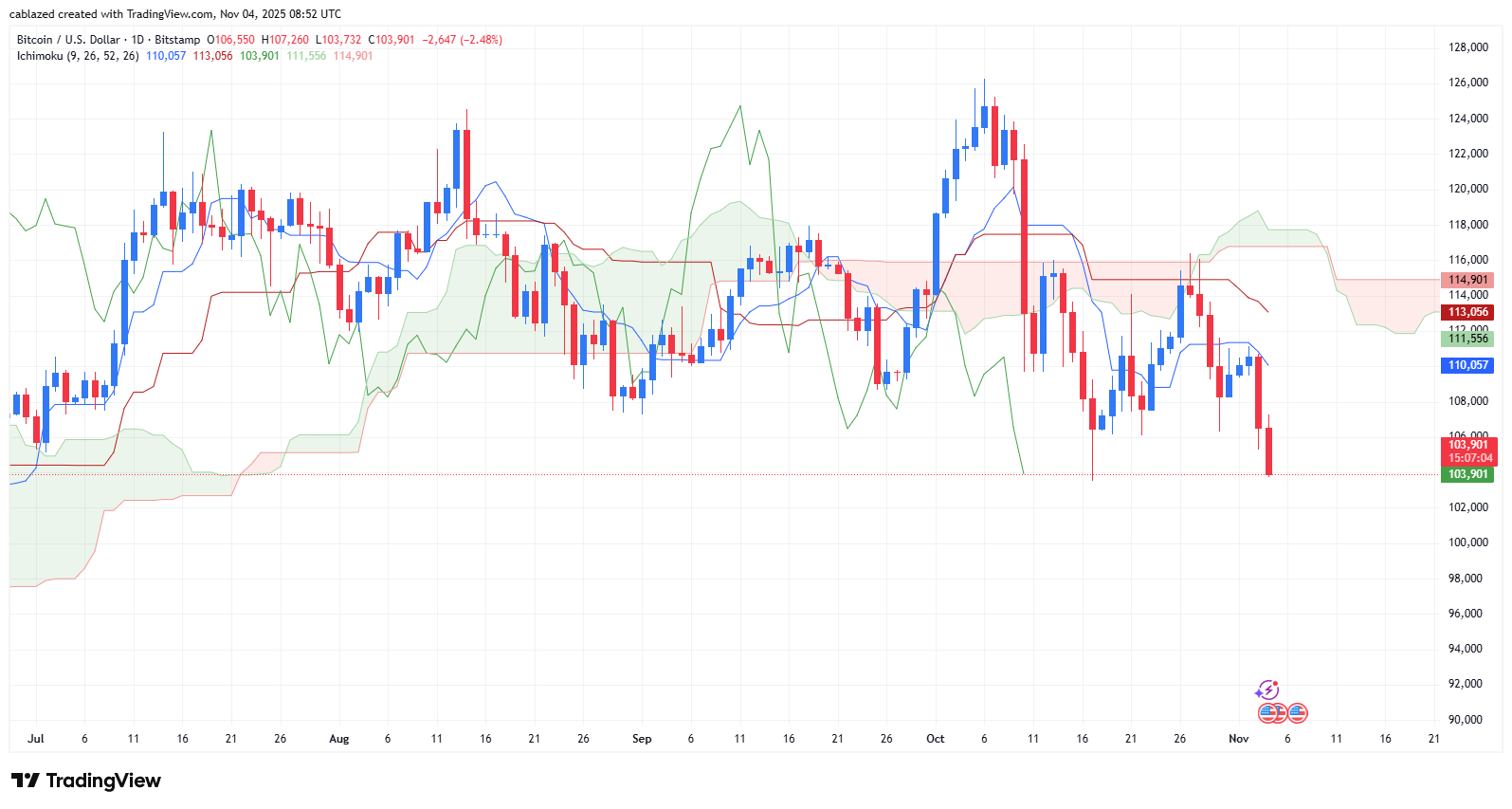 مهمتر از آن، در تایم فریم روزانه، قیمت با ارزش فعلی در حدود ۱۰۳,۹۰۱ دلار، به وضوح از زیر خطوط اصلی ایچیموکو عبور کرده است. این شکست در برابر سطوح کیجونسن (۱۱۳,۰۵۶ دلار) و تنکانسن (۱۱۰,۰۵۷ دلار) رخ داده و سیگنال فروش میانمدت را فعال کرده است. این سطوح که پیشتر نقش حمایتهای دینامیک را داشتند، اکنون به مقاومتهای جدی تبدیل شدهاند.