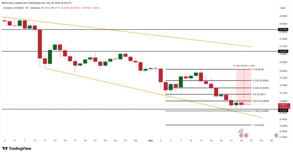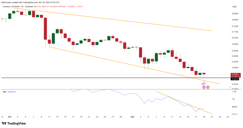 در شرایطی که بازار کریپتو این ماه روزهای سختی را پشت سر گذاشته، کاردانو یکی از ضعیف‌ترین ارزهای بزرگ بازار بوده و فشار فروش سنگینی را تحمل کرده است. طی ۳۰ روز گذشته، قیمت ADA نزدیک به ۳۰٪ سقوط کرده و از ۱۱ نوامبر (۲۰ آبان) تاکنون هم افتی نزدیک به ۲۶٪ داشته است. این کاهش شدید باعث شده قیمت تا لبه پایینی الگوی وج نزولی برسد؛ این الگو معمولاً نشانه‌ای بالقوه برای بازگشت است، اما اگر شکسته شود می‌تواند یک روند نزولی طولانی‌مدت را تثبیت کند.