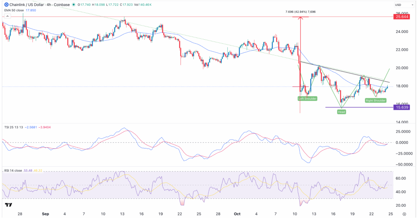 در نمودار چهار ساعته قیمت، چینلینک در حال شکلدهی الگوی سر و شانه معکوس (Inverse Head & Shoulders) است که معمولاً نشاندهنده تغییر روند و آغاز حرکت صعودی است. بخش «سر» در محدوده ۱۵.۶۳ دلار قرار دارد و خط گردن (Neckline) از سقفهای نوسانی ۱۳ و ۲۰ اکتبر (۲۱ و ۲۸ مهر) عبور میکند.