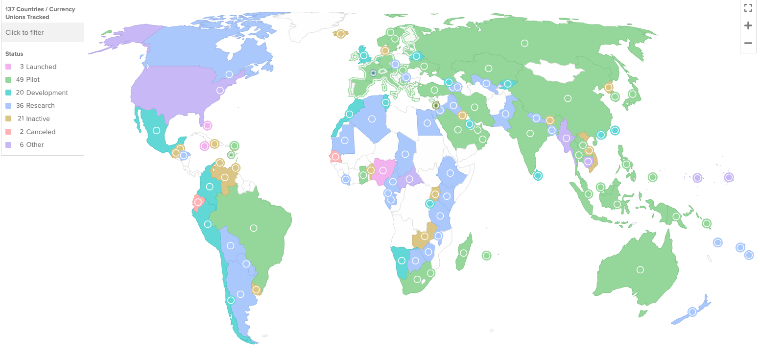 ۱۳۷ کشور که در مجموع ۹۸٪ از تولید ناخالص داخلی جهان را نمایندگی می‌کنند، در حال بررسی ارز دیجیتال بانک مرکزی هستند. – منبع: Atlantic Council – CBDC Tracker