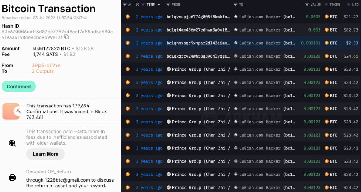 بر اساس این داده‌ها، در تاریخ ۵ جولای ۲۰۲۴، آدرس مرتبط با هکر استخر لوبین «LuBian.com Hacker» تمامی بیت کوین‌های خودش یعنی ۱۲۰٬۵۷۶ واحد را طی یک تراکنش به آدرسی با تگ «US Government: Chen Zhi Seized Funds» منتقل کرده است. به گفته مرکز CVERC، این انتقال به معنای تسلط کامل دولت آمریکا بر دارایی‌های سرقت‌شده پس از حدود چهار سال سکوت بوده است.