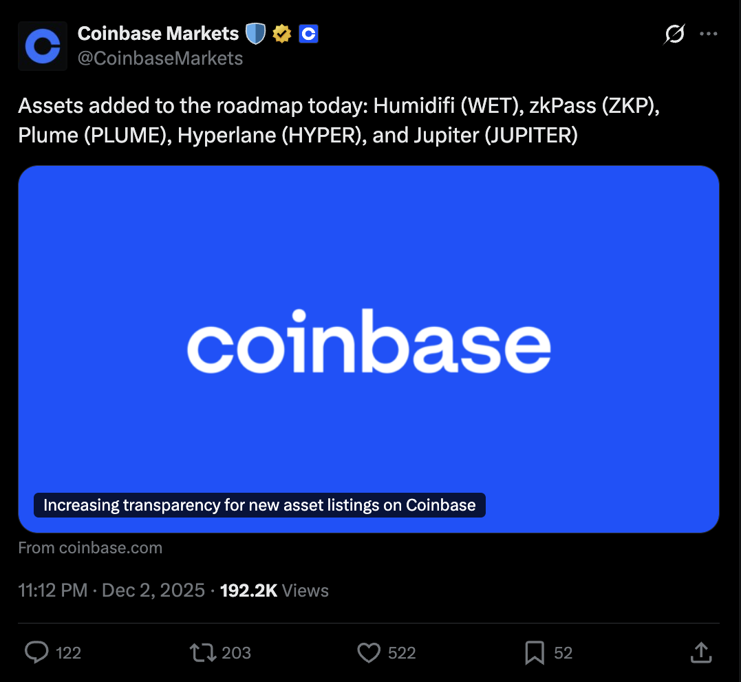 در هفته نخست دسامبر، صرافی آمریکایی کوینبیس اعلام کرد پنج دارایی جدید را به نقشه راه لیستینگ خود اضافه کرده است. این نقشه راه فهرستی از توکنهایی است که در مرحله بررسی قرار دارند و در صورت تأمین زیرساختهای فنی کافی و پشتیبانی بازارسازها، امکان لیستینگ رسمی آنها وجود خواهد داشت. کوینبیس اعلام کرد زمان شروع معاملات هر توکن در آینده اطلاعرسانی میشود.