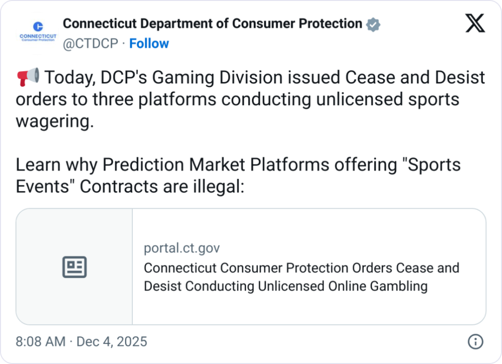 ایالت کنتیکت اعلام کرده است که سه شرکت رابینهود (Robinhood)، کالشی (Kalshi) و کریپتو داتکام (Crypto.com) از طریق قراردادهای رویدادی، نوعی پیشبینی ورزشی غیرقانونی و بدون مجوز را در این ایالت ارائه میکنند.