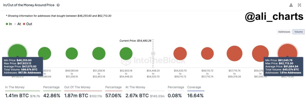 در حال حاضر بیتکوین حمایت قابل توجهی ندارد. ناحیهی اصلی تقاضا حدودا ۴۷٬۰۰۰ است و برای اینکه روند صعودی ادامهدار باشد، بیتکوین باید بالای ۶۱٬۰۰۰ دلار بسته شود و باقی بماند.