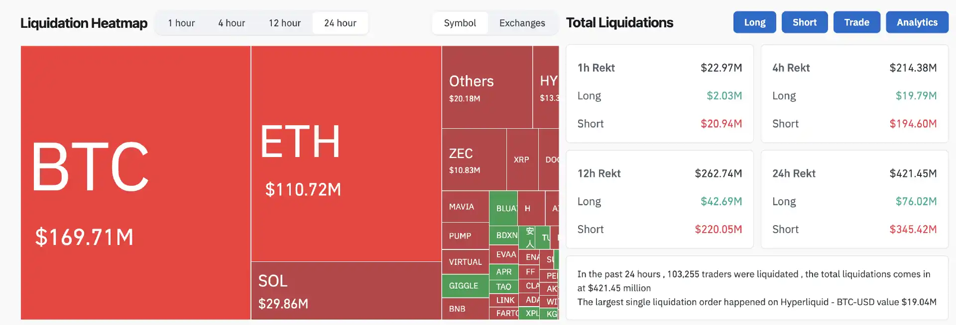 داده‌های پلتفرم کوین‌گلس (Coinglass) نشان می‌دهد که در ۲۴ ساعت گذشته بیش از ۴۲۱ میلیون دلار پوزیشن در بازار لیکوئید شده که ۳۴۵ میلیون دلار آن مربوط به معاملات شورت بوده است.