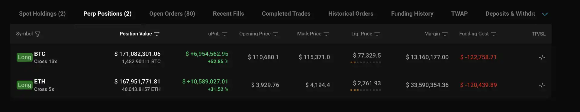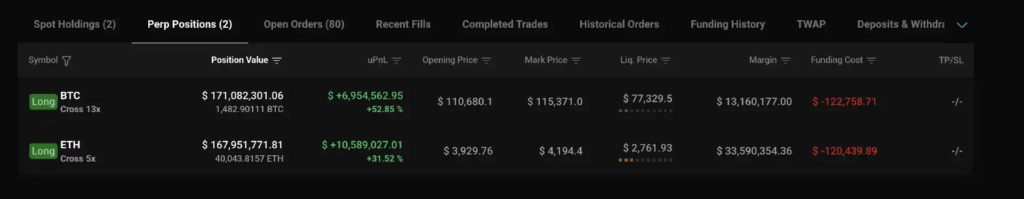 داده‌های هایپربات (HyperBot) نشان می‌دهد این نهنگ که در جامعه معاملاتی به نهنگ ۱۱ اکتبر با نرخ برد ۱۰۰٪ مشهور شده، در حال حاضر پوزیشن لانگ بیت کوین با لوریج ۱۳ و پویشن لانگ اتریوم با لوریج ۵ در اختیار دارد و تاکنون حدود ۱۷.۵۴ میلیون دلار سود محقق‌نشده ثبت کرده است.
