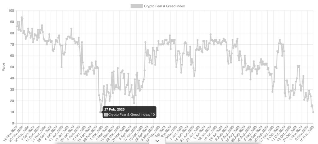 شاخص ترس و طمع کریپتو در تازهترین بهروزرسانی روز شنبه خود، عدد ۱۰ را ثبت کرده که در محدوده ترس شدید قرار میگیرد. این پایینترین میزان شاخص از ۲۷ فوریه (۹ اسفند) تاکنون است. افت شاخص همزمان با کاهش قیمت بیت کوین به زیر ۹۵,۰۰۰ دلار در روز جمعه رخ داد که تا زمان انتشار گزارش نیز نتوانست دوباره سطح ۹۶,۰۰۰ دلار را پس بگیرد. دادهها نشان میدهد روند فعلی ادامه همان فشار فروشی است که در روزهای اخیر شدت گرفته است.