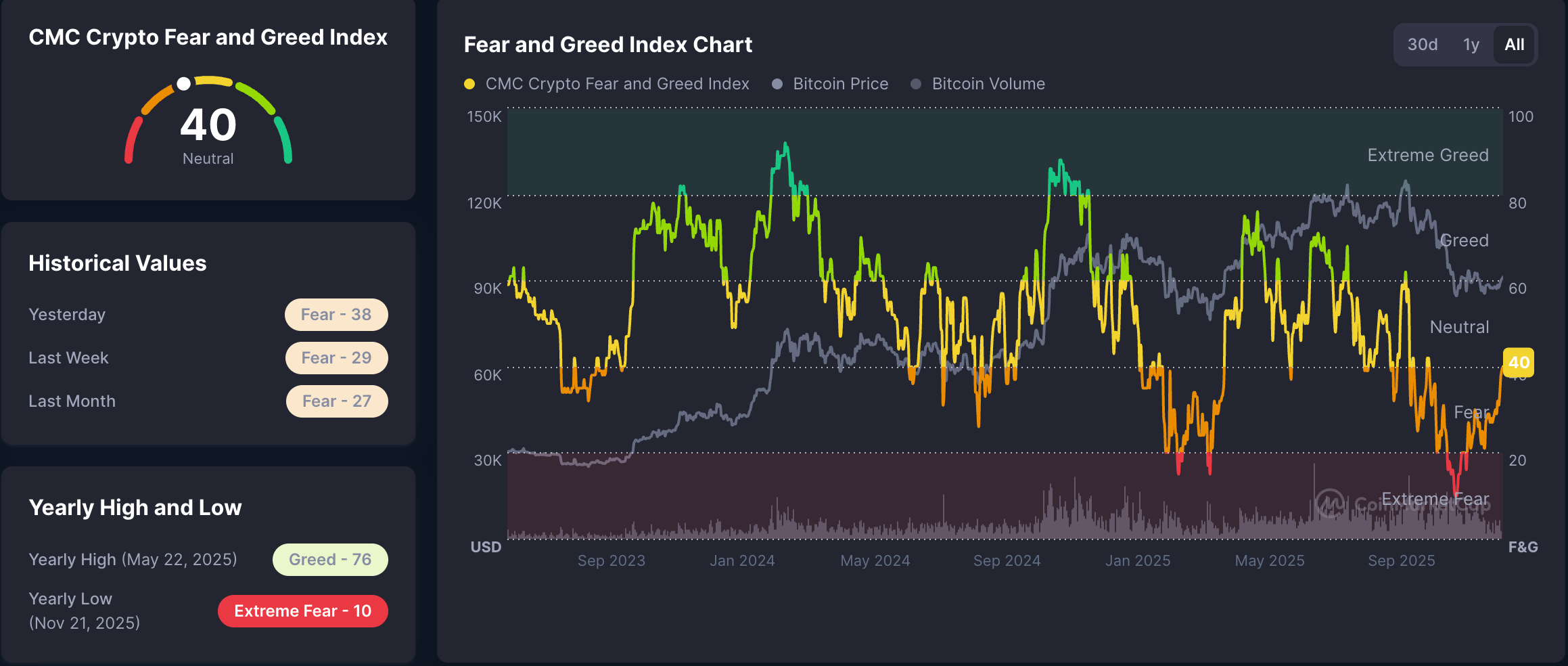 به گزارش میهن بلاکچین، این شاخص اکنون روی عدد ۴۰ قرار دارد؛ یعنی سرمایهگذاران دیگر «ترسیده» نیستند، اما در عین حال نسبت به بازار کریپتو هم دیدگاه «صعودی» ندارند. به گفته کوینمارکتکپ، این شاخص در نوامبر کمترین سطح احساسات در سال ۲۰۲۵ را ثبت کرد و با رسیدن به عدد ۱۰، وضعیت «ترس شدید» را نشان داد.