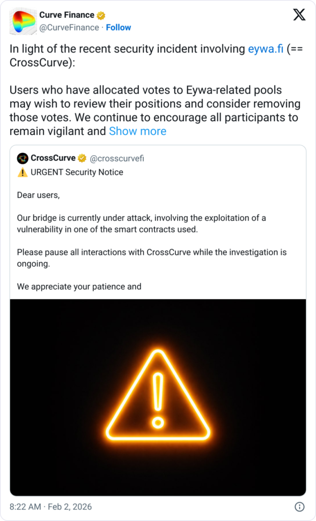 پس از انتشار این خبر، پروژه کرو فایننس (Curve Finance) که با کراسکرو همکاری داشته، واکنشی محتاطانه نشان داد و در پیامی به کاربران اعلام کرد کسانی که سرمایه خود را به استخرهای کراسکرو اختصاص دادهاند، بهتر است وضعیت موقعیتهای خود را بررسی کنند و حتی حذف رأیهای تخصیصیافته را در نظر بگیرند.
