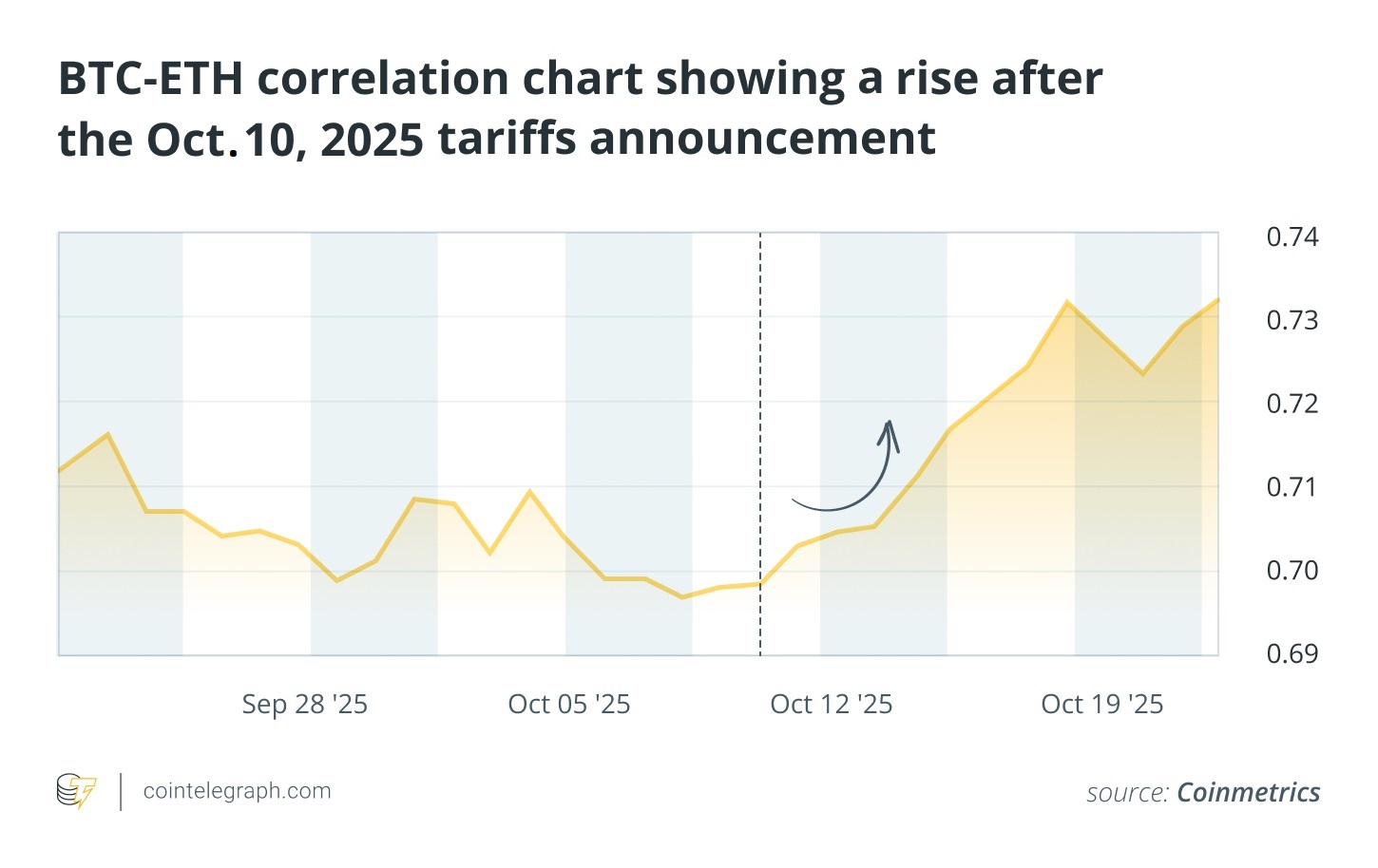 به عنوان مثال، پس از اعلام تعرفههای تجاری جدید آمریکا بر واردات از چین در تاریخ ۱۰ اکتبر ۲۰۲۵، بازار کریپتو با فشار فروش گستردهای مواجه شد و قیمت بیت کوین به شدت کاهش یافت. طبق دادههای کوینمتریکس، در آن بازه همبستگی بیتکوین و اتریوم از ۰.۶۹ به ۰.۷۳ و همبستگی بیتکوین و ریپل از ۰.۷۵ به ۰.۷۷ افزایش یافت.