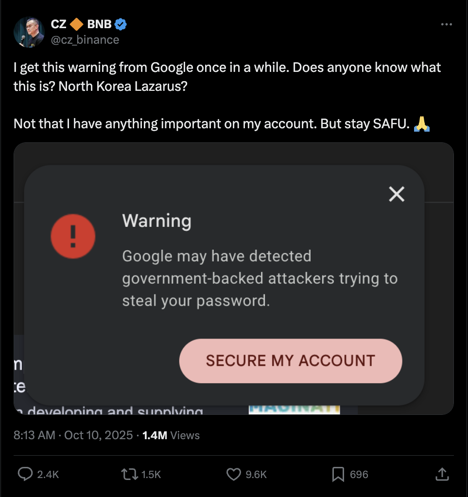 یکی از مقامات دولتی که من شخصاً میشناسم، هشداری مشابه CZ از گوگل دریافت کرد مبنی بر اینکه هکرهای دولتی قصد سرقت رمز عبور حسابش را دارند؛ با این حال، گوگل به دلیل مسائل امنیتی از ارائه جزئیات بیشتر خودداری کرد.