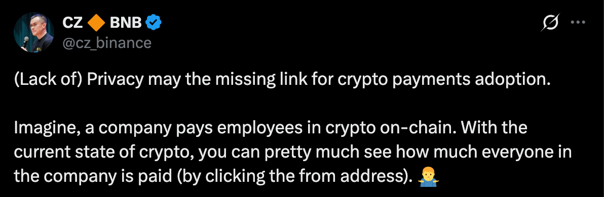 به گزارش میهن بلاکچین، ژائو که در بازار ارزهای دیجیتال با نام مستعار «CZ» شناخته می‌شود، تأکید دارد که این سطح از شفافیت مانع بزرگی برای کسب‌وکارها و سازمان‌هاست تا هزینه‌های خود را با ارز دیجیتال بپردازند. او این موضوع را «حلقه مفقوده» در مسیر گسترش پرداخت‌های کریپتویی توصیف کرد.