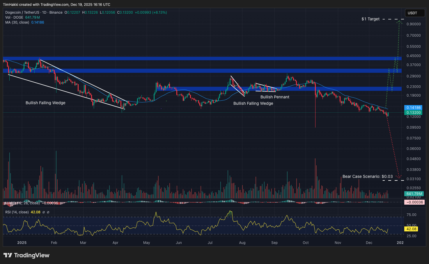 این میم کوین در اواخر تابستان و اوایل پاییز الگوهای تکنیکالی صعودی متعددی تشکیل داد، اما شتاب حرکت آن در هفتههای اخیر کاهش یافته است. در سناریوی نزولی دیپسیک، قیمت دوج کوین میتواند تا محدوده ۰.۰۳ دلار افت کند؛ یعنی حدود ۷۷٪ نسبت به قیمت فعلی (نزدیک به ۰.۱۳۱۸ دلار) کاهش یابد.