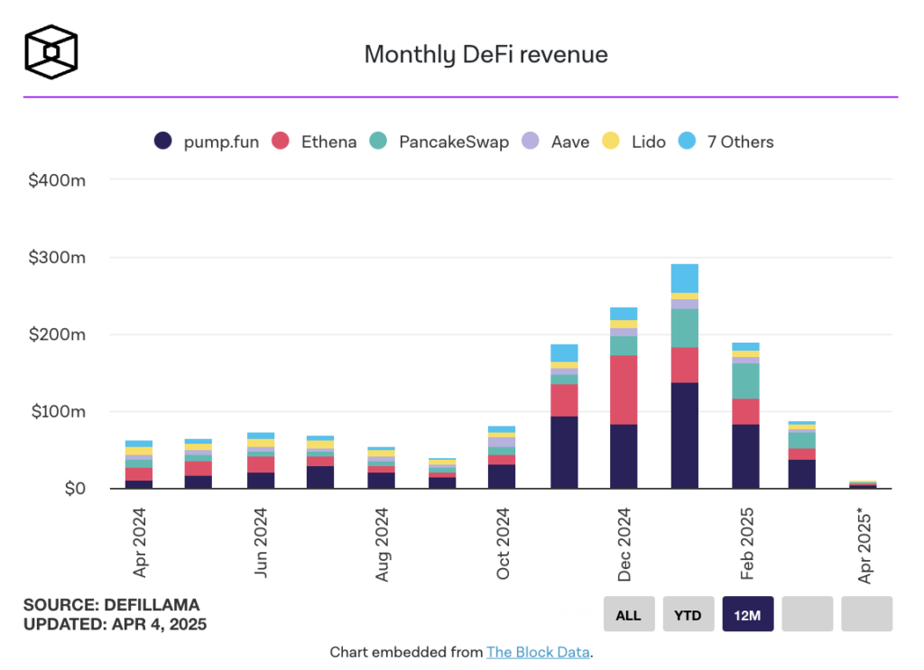 در همین حال، پروتکلهای دیفای مبتنی بر اتریوم، از جمله اتنا (Ethena)، لیدو (Lido)، آوه (Aave)، کرو (Curve)، کامپوند (Compound) و سوشی (Sushi) نیز الگوی مشابهی را نشان دادهاند. این گروه از پروتکلها در مجموع تنها ۲۴.۵ میلیون دلار در ماه مارس کسب کردهاند که نسبت به ماه فوریه بیش از ۵۲٪ و نسبت به ژانویه ۶۵٪ کاهش داشته است.