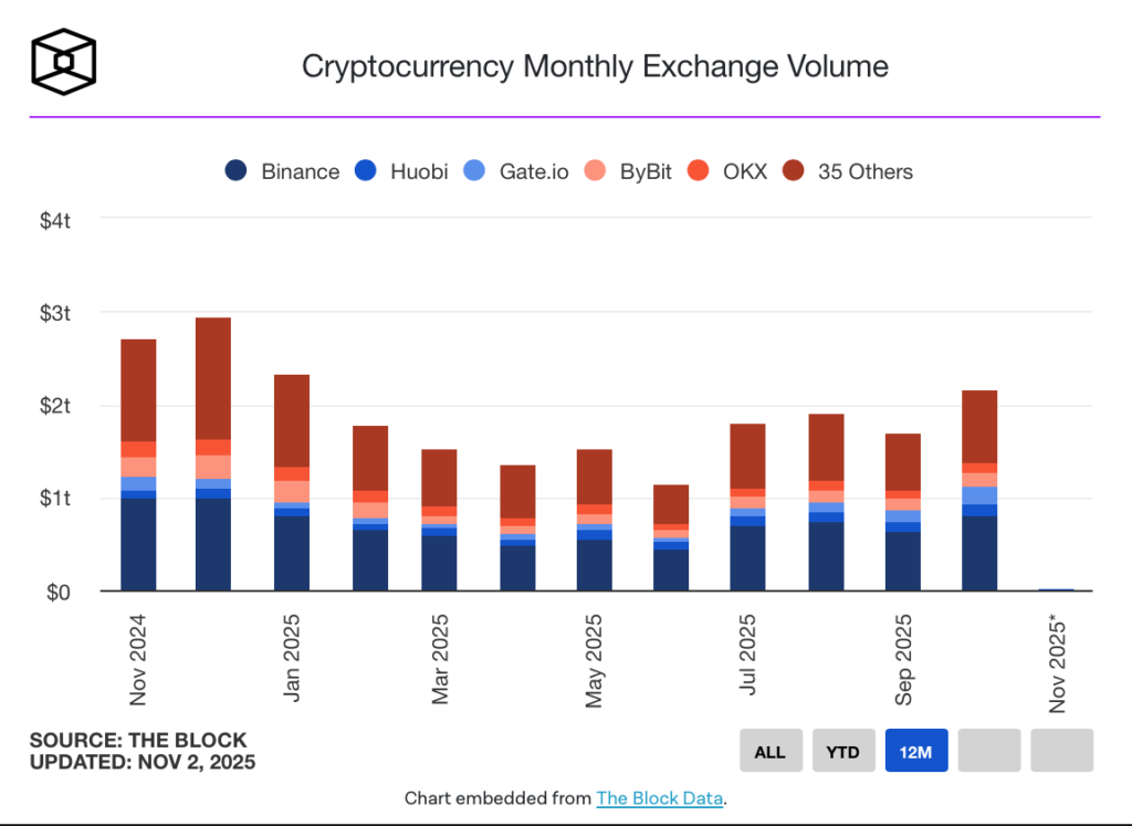 در همین حال، صرافیهای متمرکز (CEX) نیز ماه پرفروغی را پشت سر گذاشتند. بر اساس دادههای وبسایت د بلاک (The Block)، حجم معاملات آنها در اکتبر به ۲.۱۷ تریلیون دلار رسید که بالاترین سطح از ژانویه ۲۰۲۵ محسوب میشود. این رقم نسبت به سپتامبر، حدود ۲۸٪ رشد داشته است.