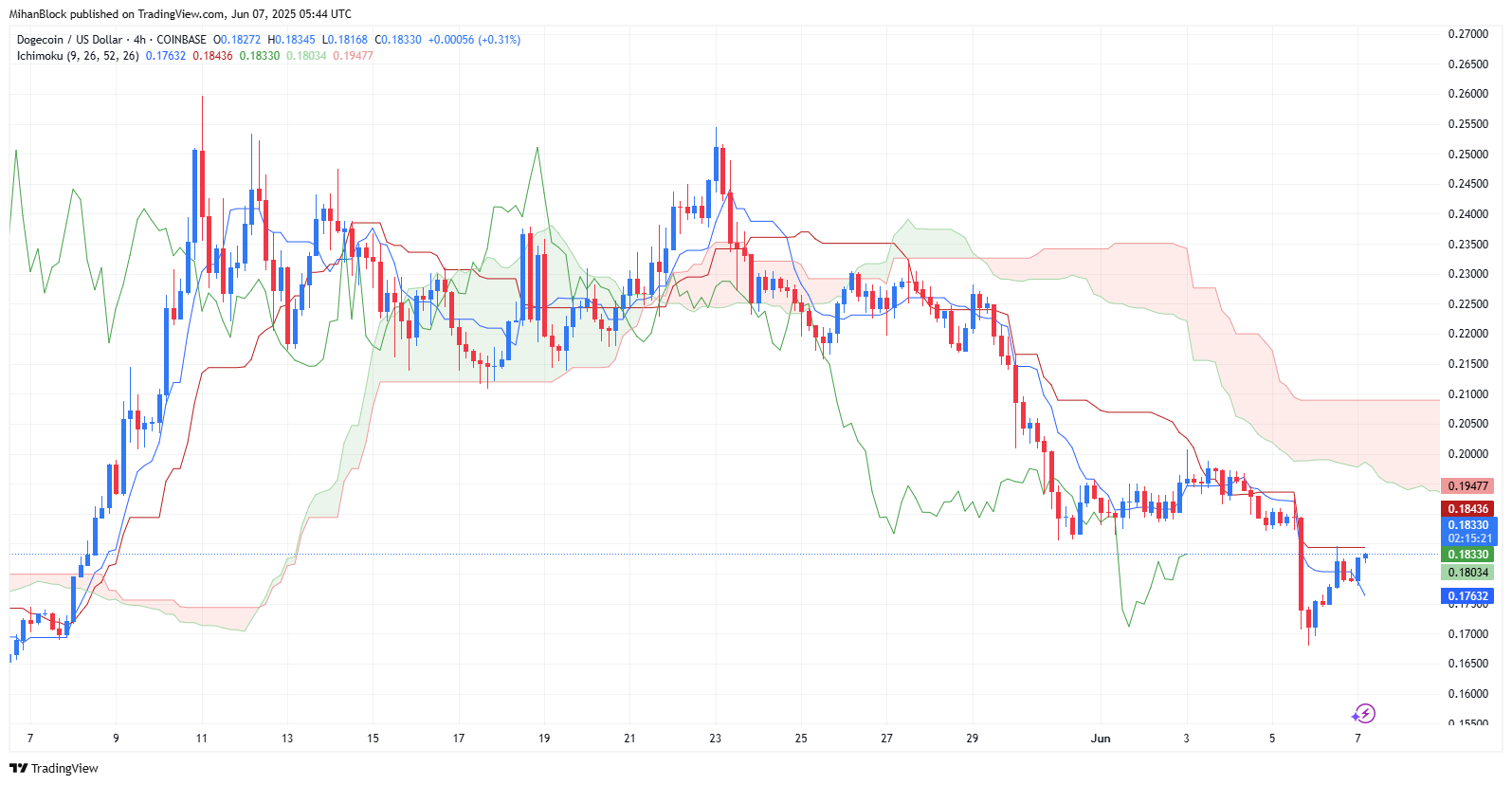 قیمت در حال حاضر پایینتر از ابر ایچیموکو معامله میشود و این ابر به عنوان یک ناحیه مقاومت قابل توجه عمل میکند. پس از یک افت شدید اخیر، قیمت نشانههایی از یک اصلاح صعودی جزئی را بروز داده، اما در حال حاضر توسط خط کیجونسن (حدود ۰.۱۸۴۳ دلار) متوقف شده است. برای اینکه بتوان به تغییر روند صعودی امیدوار بود، قیمت باید با قدرت از خط کیجونسن و پس از آن از کل ابر ایچیموکو عبور کند.